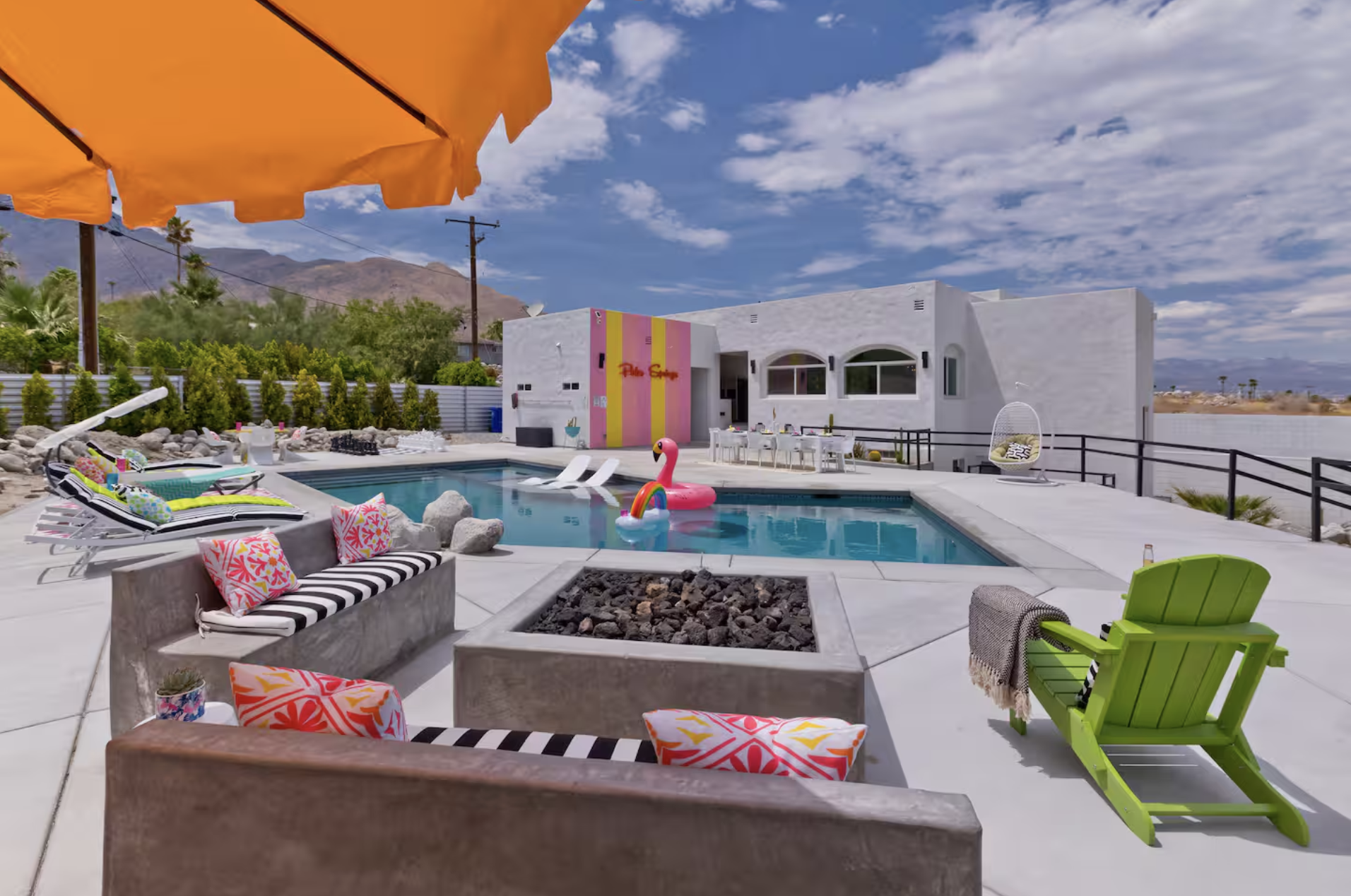 Our home base is a private retreat home in Palm Springs. Three king suites, each with a private bathroom. One shared room with two queen beds. A heated pool. A full kitchen. Outdoor living spaces designed for the desert.